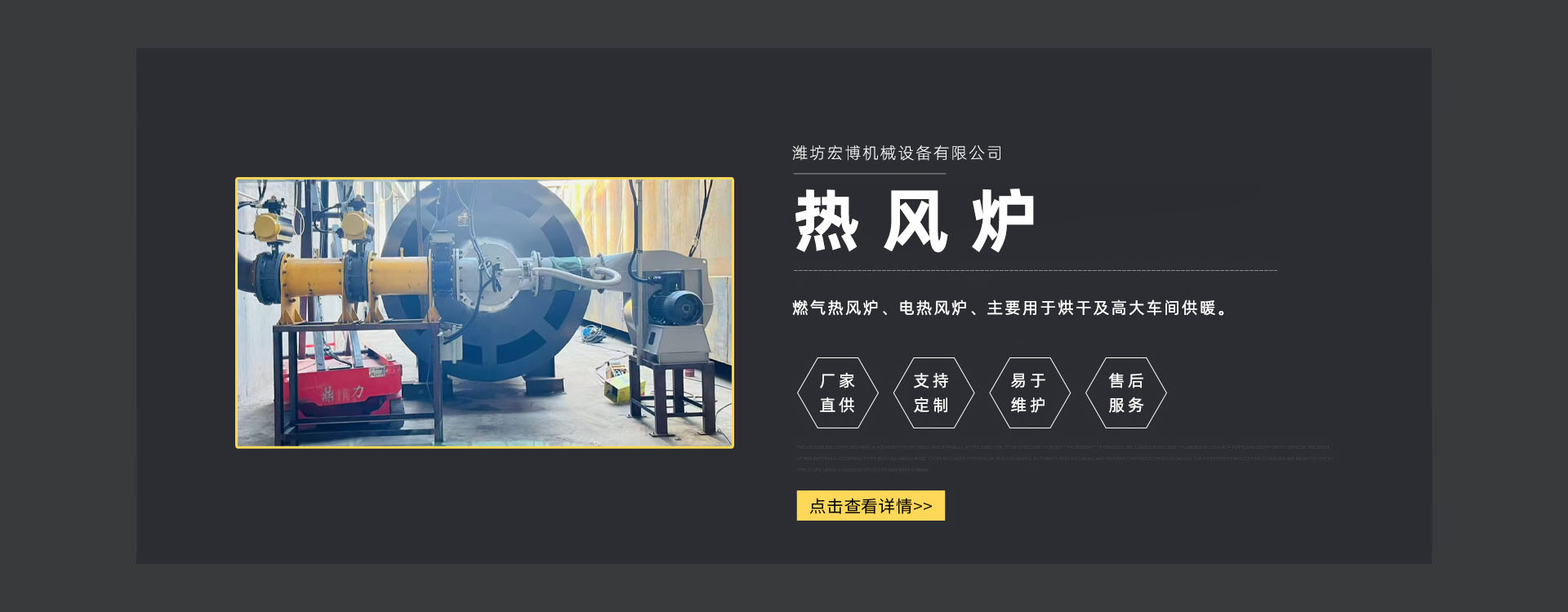 濰坊宏博機械設(shè)備有限公司是從事熱風爐、烘干設(shè)備、供暖設(shè)備的研發(fā)、設(shè)計、制造和服務(wù)于一體的實體企業(yè)。長期以來,企業(yè)以市場的發(fā)展和客戶的需求為導(dǎo)向,集多年的生產(chǎn)技術(shù)與經(jīng)驗為一體,不斷開發(fā)和優(yōu)良產(chǎn)品。